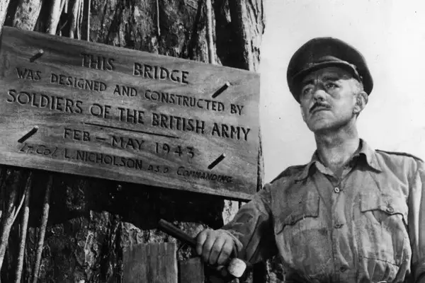 La folie de la guerre n'a jamais eu un avatar exquis en tant que lieutenant-colonel Nicholson, qui a fièrement confondu la victoire et perd presque la Seconde Guerre mondiale. Un prisonnier de guerre peut être torturé dans une question du début, un principe égoïste qui l'exclut ainsi que ses fonctionnaires de travail manuel et est si impossible qu'il restreint ses ravisseurs psychologiquement. Et puis, juste pour démontrer sa taille britannique une fois pour toutes, il décide de construire le meilleur pont construit pour l'ennemi. Guinness comprend la justice absolue nécessaire pour justifier la monomanie de Nicholson et l'extrême absolue qui est nécessaire pour le combattre à nouveau dans le monde réel.