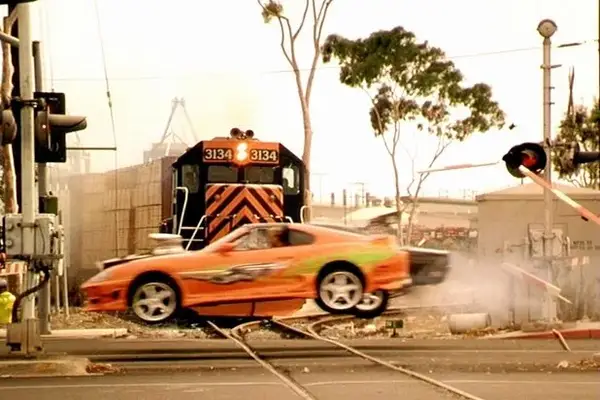 La scène de saut en train était de deux coups de feu. La scène à la fin du film, dans laquelle Brian et Cathedral ont à peine remporté un train pendant la course, a été tourné deux fois. Le train n'était pas sur le point de frapper les voitures, même si la scène qui s'oppose à la mort .
