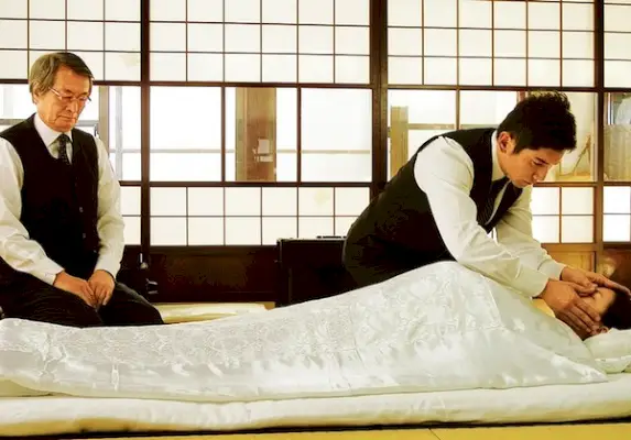 Une fois le couple installé dans leur nouvelle maison, Daigo cherche un emploi. Il trouve une annonce dans le journal annonçant un poste qui nécessite peu d'heures, aucune expérience et se concentre sur l'aide aux autres dans leurs voyages. Daigo suppose que le poste est celui d'un agent de voyages, mais lorsqu'il arrive au bureau, il se rend compte que le travail est celui d'un encoffineur (Nokanshi) - semblable à un embaumeur aux États-Unis, mais exige que l'encoffineur travaille devant le défunt dans une cérémonie ancrée dans la tradition. Le travail d'encercueil n'est pas un métier populaire au Japon et les gens considèrent souvent ce travail comme étant sale. Daigo essaie de garder son travail secret, mais bientôt des rumeurs se répandent dans la petite ville. Lorsque la femme de Daigo apprend son nouvel emploi, elle lui donne l’ultimatum de quitter son emploi, sinon elle le quittera.