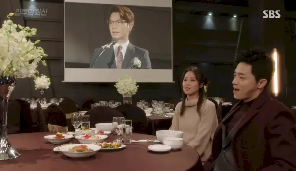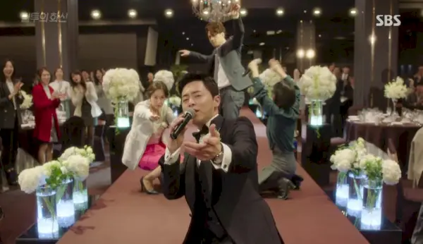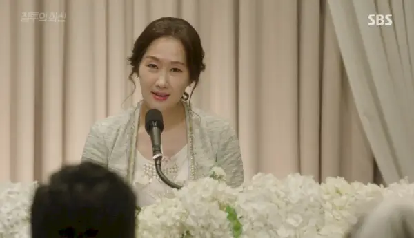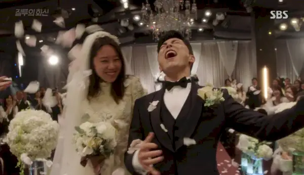 Dans la salle des mariages, belle-mère s'incline devant la mère grincheuse de Hwa-shin de l'autre côté de l'allée, et toutes les personnes que nous connaissons sont là. Jung-won est le maître de cérémonie après tout et annonce le marié sous des cris et des acclamations. Hye-won sourit à Hwa-shin qui se pavane dans cette allée. Il fait un signe de tête à maman (qui est fière de lui après tout), échange des sourires avec Jung-won.