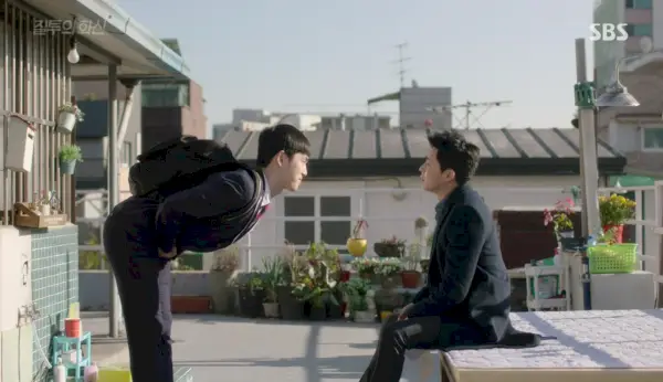 Aww non, dehors, Chi-yeol reste assis sur le porche toute la nuit, frissonnant… et il est toujours là le matin, quand Hwa-shin sort. Il bondit pour le confronter, bien que tous deux se regardent jusqu'à ce que Hwa-shin le salue, l'appelant son beau-frère. Chi-yeol est tellement indigné que son poing s'envole, mettant Hwa-shin dans la bouche. Il est en colère contre Hwa-shin en banmal, lui demandant ce qu'il fait en partant à ce moment-là.