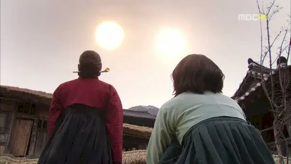 Nok-young et Jan-shil lèvent les yeux vers le ciel pour voir deux soleils converger. Juste au cas où la métaphore n'était pas assez claire et que tu as passé vingt épisodes je ne comprends pas . Au moment où les soleils se rencontrent, nous voyons également une lune engloutie, symbolisant la mort de Bo-kyung.