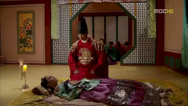Un autre corps repose silencieusement dans le palais : Bo-kyung, qui a été découvert et déposé dans sa chambre. Il y a une corde brûlée autour de son cou et ses dames sanglotent.