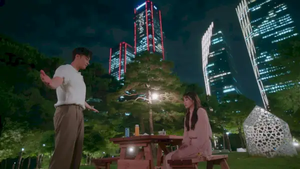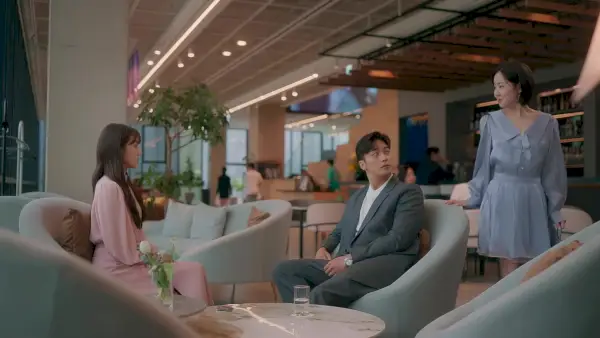 Yoo-ra, indignée, entre en scène mais les deux sont pleinement impliqués dans le jeu en cours (je ne pense même pas). ils sais à ce stade), et ils se dirigent vers l'ascenseur bras dessus bras dessous, faisant tout un spectacle. Le trajet en ascenseur est gênant et Do-gook semble aimer la taquiner, ce qu'il fait amplement avec quelques commentaires formulés de manière suggestive. Mais la suite de l’hôtel est en fait son bureau à temps partiel – hah, je le savais – et ils sont là pour parler affaires. Eh bien, avec un peu de flirt intense aussi. Yi-joo leur sert du vin et aborde l'efficacité commerciale de leur potentiel mariage de convenance, et nous pouvons dire au visage de Do-gook qu'il a déjà pris sa décision.