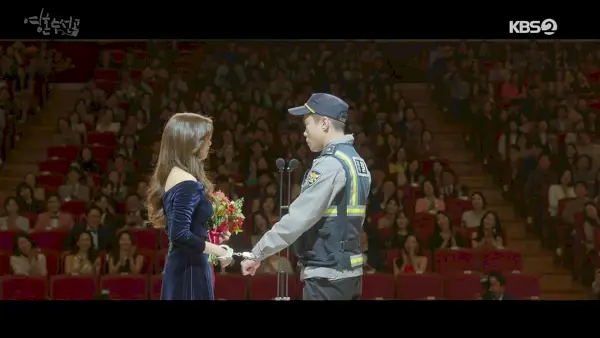 La circulation est épouvantable et Woo-joo arrive en retard à la cérémonie de remise des prix malgré les avertissements. Elle se gare illégalement et tente de se faufiler dans le bâtiment, mais elle est arrêtée par un flic… enfin, Dong-il en tout cas, qui pense qu'il monte la garde pour le spectacle.
